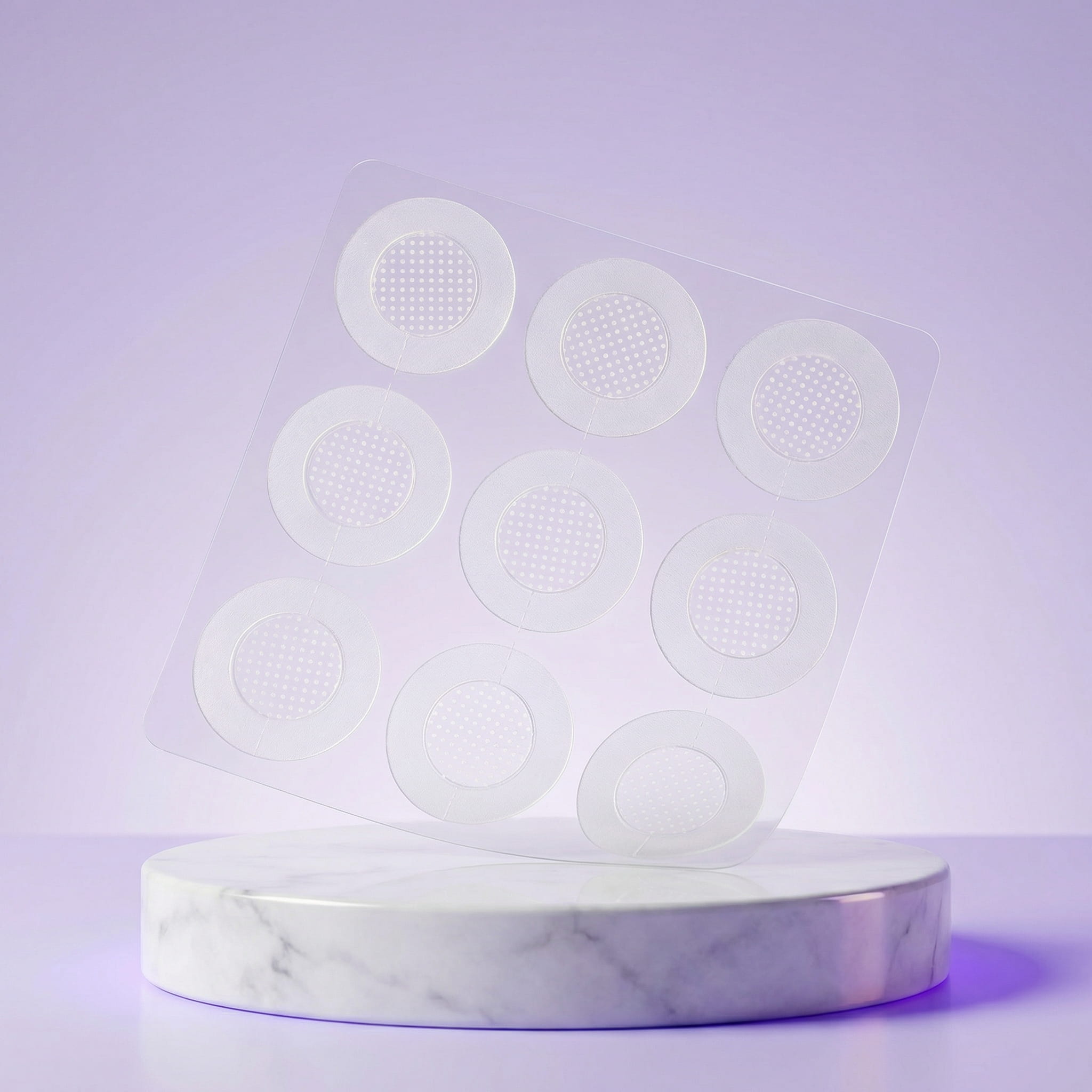 Transparent, fragrance-free, and painless. The 12mm round patches are discreet and biocompatible — designed specifically for sensitive and reactive skin types.